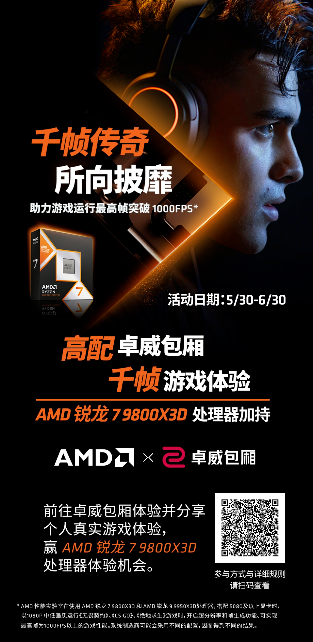 微信扫描下方二维码,进入卓威包厢小程序,选择采用AMD锐龙7 9800X3D处理器的网咖,并分享个人真实游戏体验,就有机会赢得AMD锐龙7 9800X3D游戏处理器、AMD锐龙7 7800X3D游戏处理器体验机会。