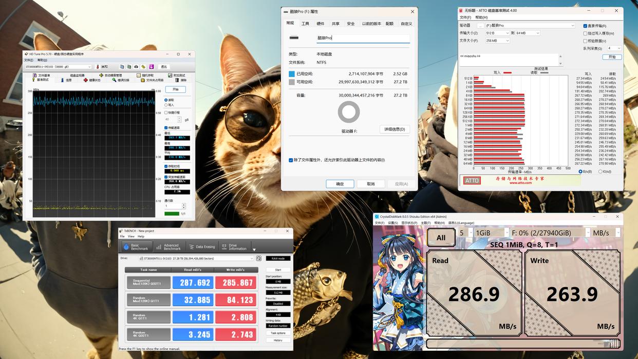 作为一款大容量的NAS专用盘,酷狼Pro 30TB在速度和稳定性上的表现都很不错,挂载之后磁盘容量为27.2TB,HD Tune Pro的连续传输曲线最低 263.7MB/s,最高288.3MB/s,稳定在276MB/s。
