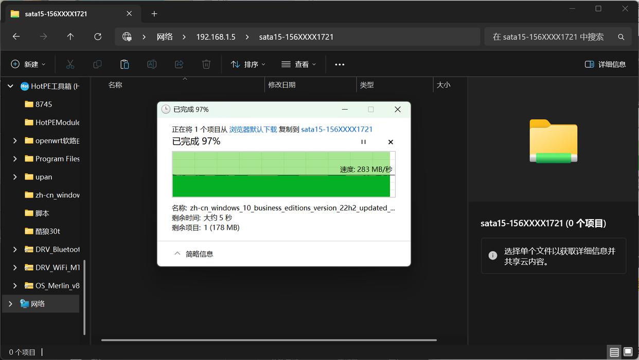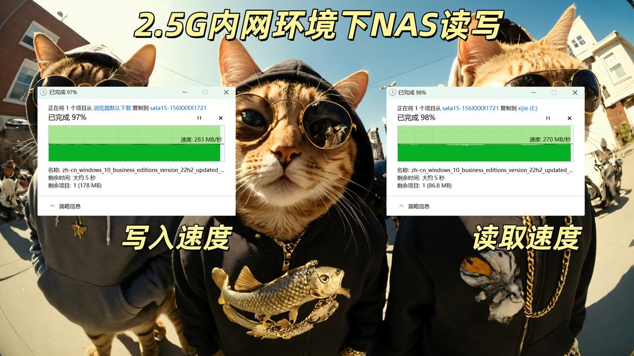 工作室的文件主要都存储在NAS中,所有人使用SMB挂载的方式来访问文件,网络为2.5G有线网络,日常拷贝工作的文件或者剪辑视频或者需要修改的图片都是通过挂载nas中文件夹的形式使用,在实际的多人使用负载测试中,写入峰值 283 MB/s,读取 270 MB/s,两条曲线几乎平直,全程无掉速。